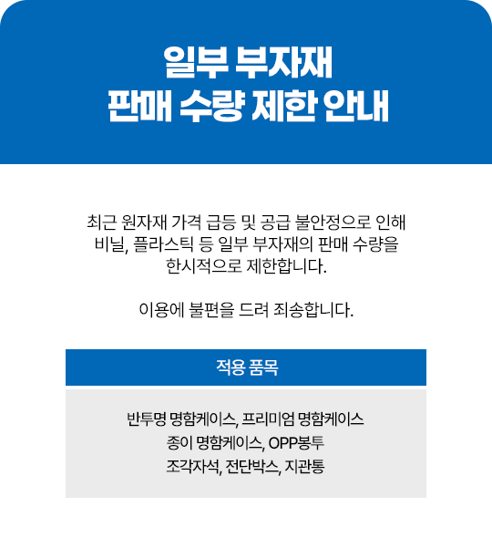 임시주문불가 용지안내원자재 수급 문제로 인해 주문이 불가한 용지를 안내해 드립니다. 고객 여러분의 많은 양해 부탁 드리며 주문 시 참고 바랍니다.